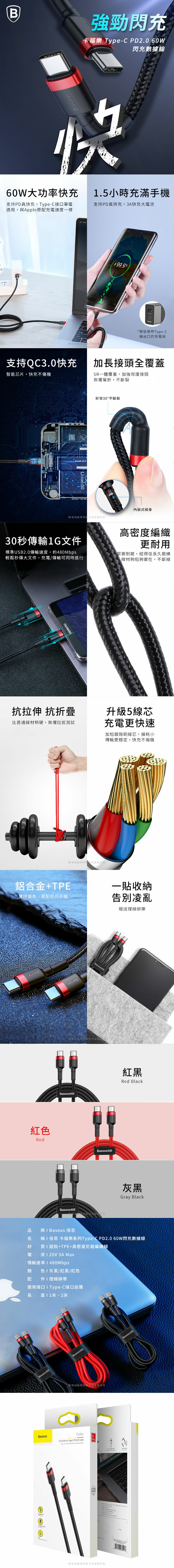 【Baseus倍思】卡福樂系列 Type-C PD2.0 閃充充電線60W / 100W
