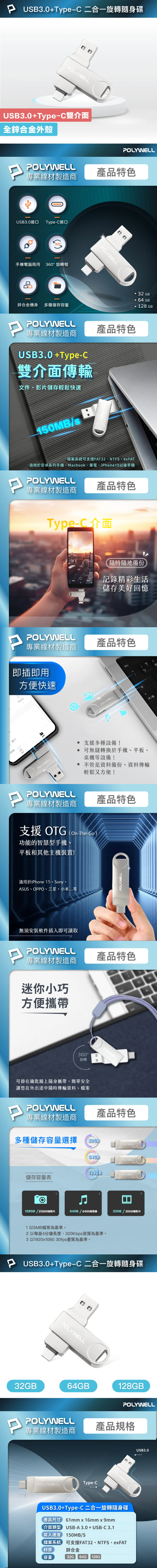 【POLYWELL】USB 3.0+Type-C 二合一旋轉隨身碟