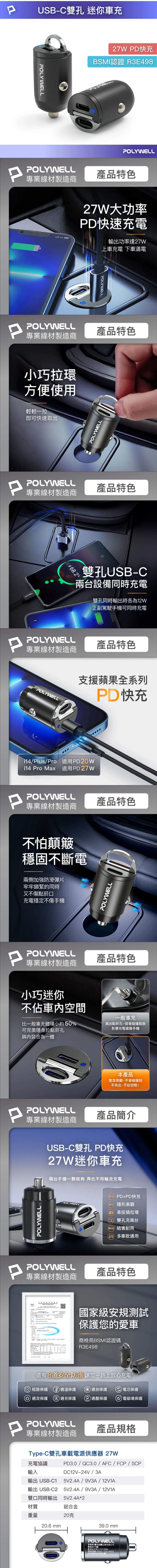 【POLYWELL】雙Type-C 27W迷你車用充電器 PD快充