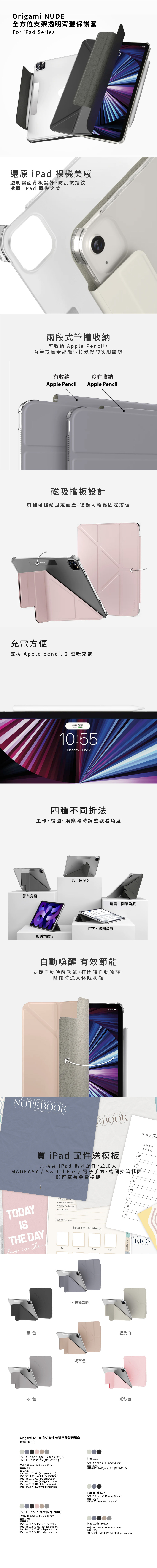 Origami Nude多功能透明保護殼,採用透明霧面背板,防刮抗指紋。內建折疊支架,提供 4 種不同的折疊及支撐方式,可任意變換使用角度,滿足多種情境。翻蓋式自動喚醒功能,滿足 iPad 重度使用者的日常所需。磁吸外扣的置筆設計,方便收納觸控筆的同時也能保持精簡外觀。