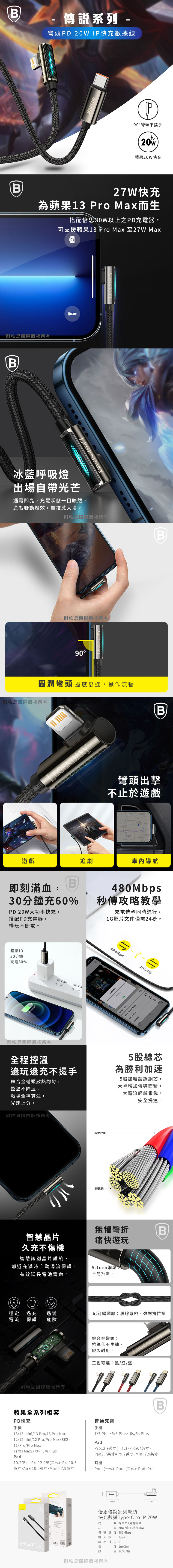 【Baseus倍思】傳說系列 彎頭 Type-C to IOS 快充數據線 20W