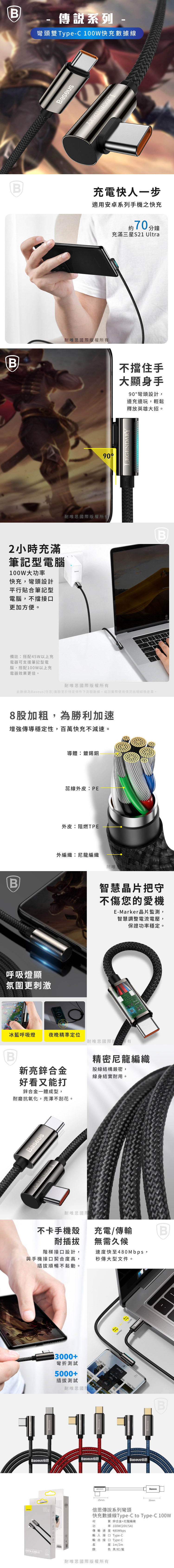 【Baseus倍思】傳說系列 彎頭 雙Type-C 快充數據線 100W