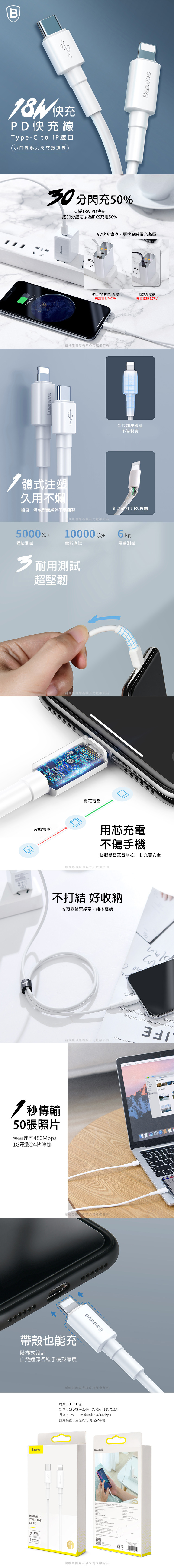 【Baseus倍思】18W小白系列 Type-C to IOS 閃充數據線